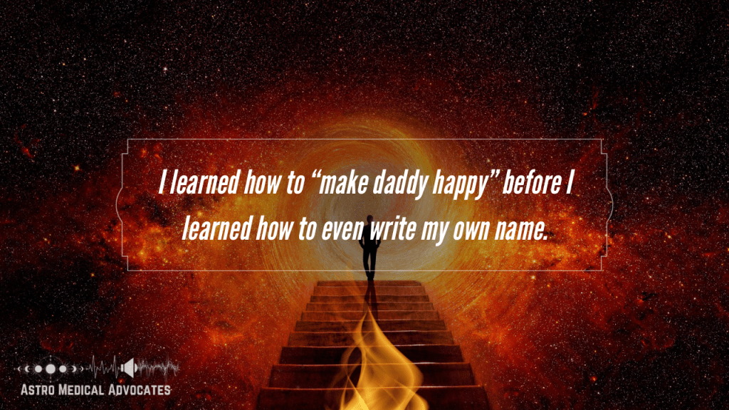I wish I could say I was safe after that. But that was only the beginning. BM would invite several more abusers into our home and gave them access to me. BM helped me reconnect with SD when I was 16, because I still believed I was daddy’s little girl, I was still blinded by the brainwashing. And he picked up right where he left off. But we’ll get into the teenage years in another post; I think this is enough for one day.