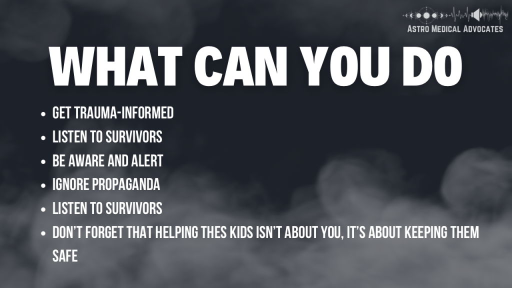 If you want to help these kids, be intentional about becoming trauma-informed. Listen to survivors. Understand that these kids are some of the most brainwashed and manipulated little humans and they’re scared. They may not know how to tell someone what’s happening; but just keep listening. I need everyone to recognize that the real threat to your children isn’t some rando snatching them from a grocery store parking lot. The narrative that trafficking only happens in “dramatic scenes” like that, gives parents a false sense of control; the idea that the threat is something external.