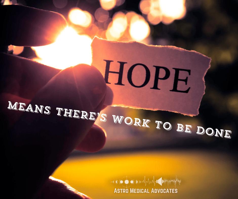 Is my own family struggling financially because of my disabilities? Yes. But that’s why I can’t, in good conscience, charge disabled folks for trying to get their medical needs met. I know what it’s like to need help but having no money to pay for it. But money means nothing to me. Money was created *by people* to put a value on the human existence. Money can be used to buy people…so money just feels irrelevant to me. I decided that Astro Medical Advocates would be a non-profit (501c3). Because there’s still hope. And hope means there’s work to be done.